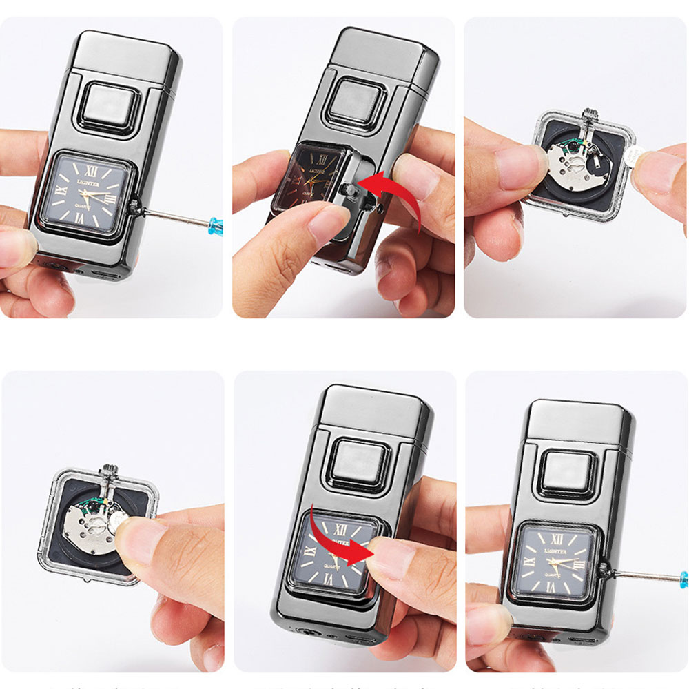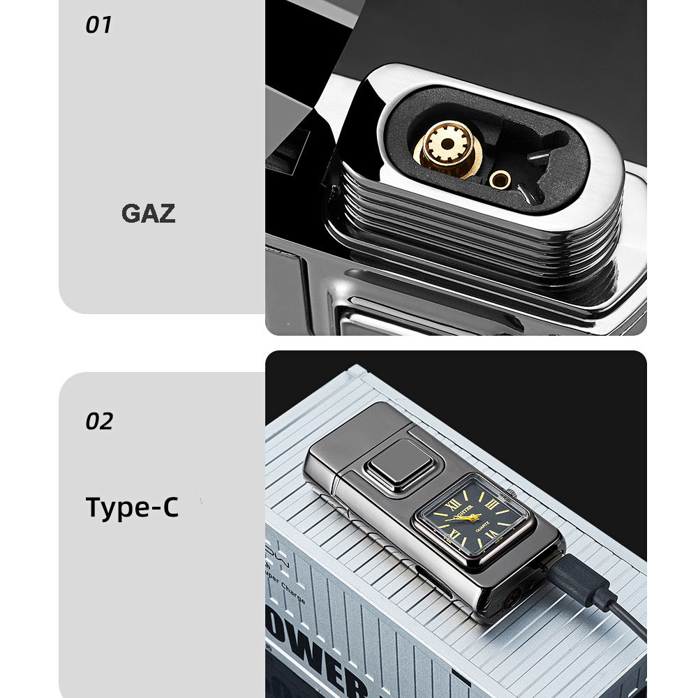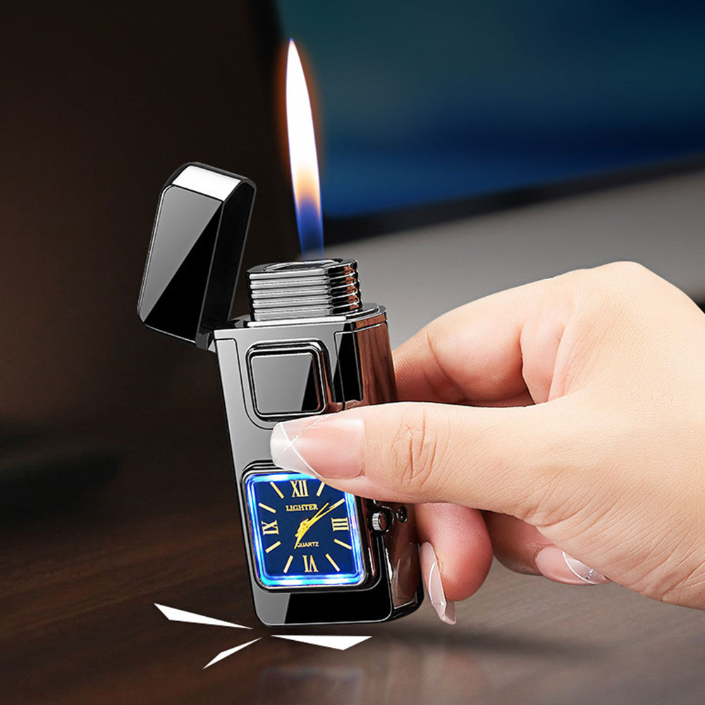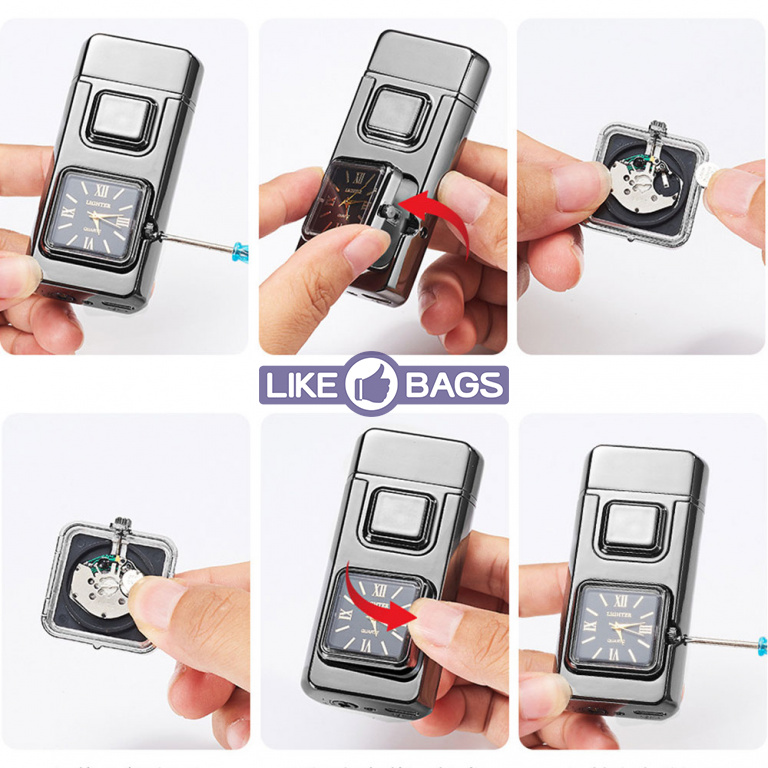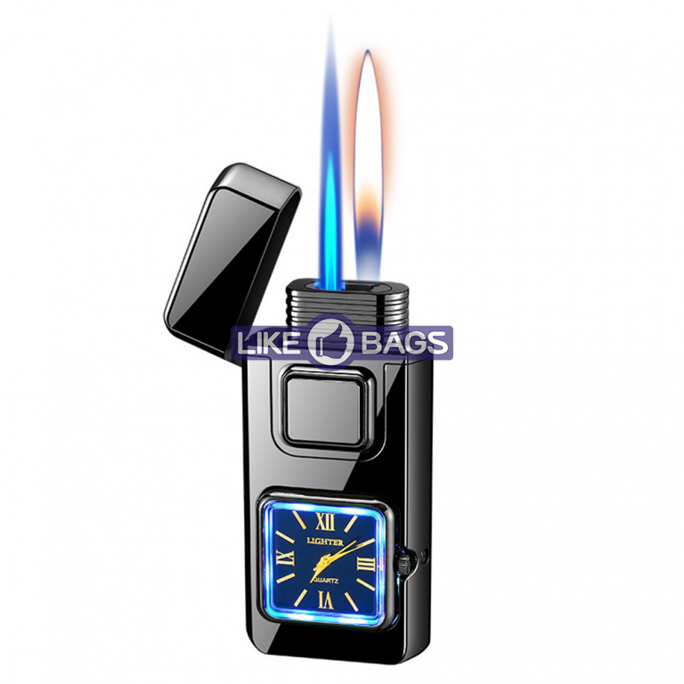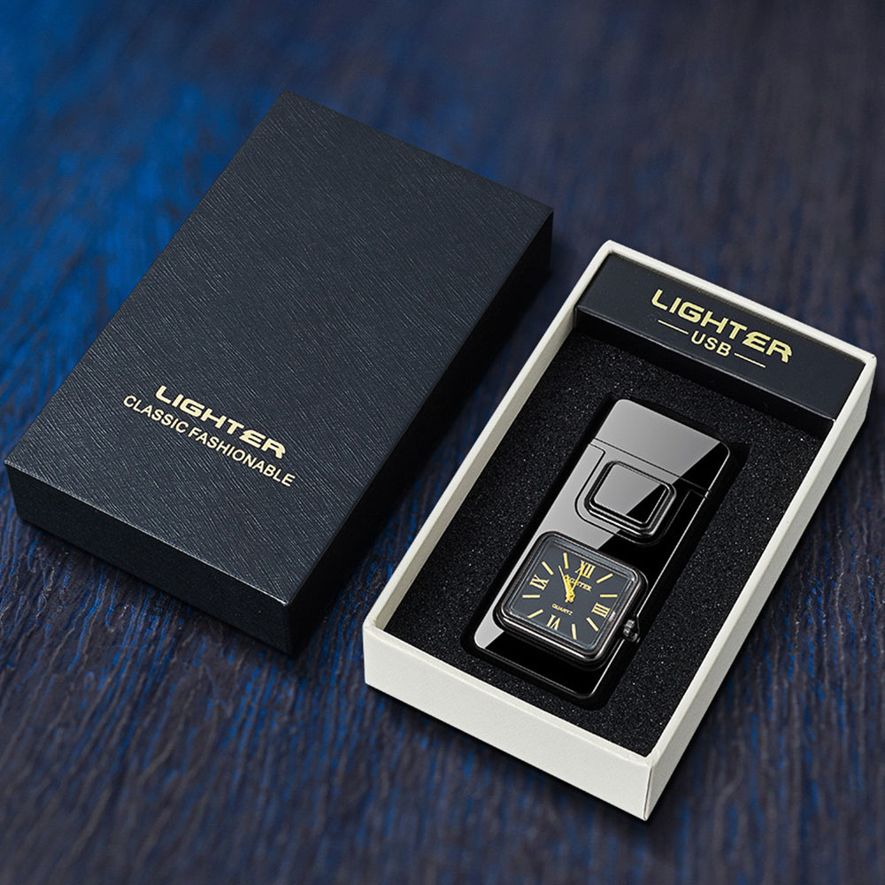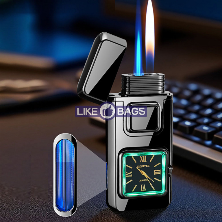 На фронтальній частині корпусу розміщено аналоговий годинник квадратної форми, який додає запальничці оригінальності та робить її не лише практичним, а й естетично привабливим аксесуаром. Це поєднання функцій і стилю, що привертає увагу з першого погляду.