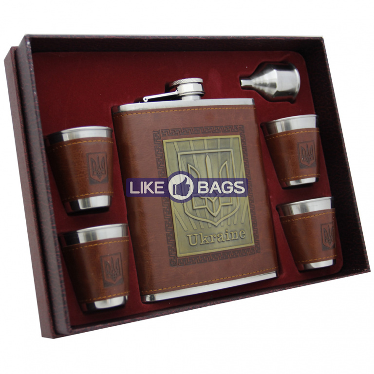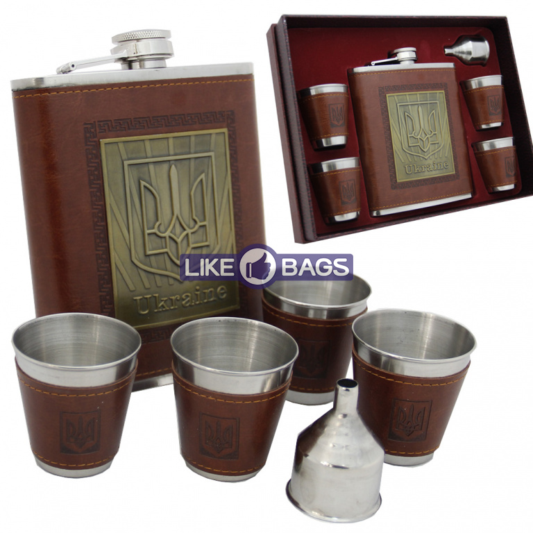 Фляга з гербом Україна в подарунковій упаковці 18oz, 4 чарки та лійка.