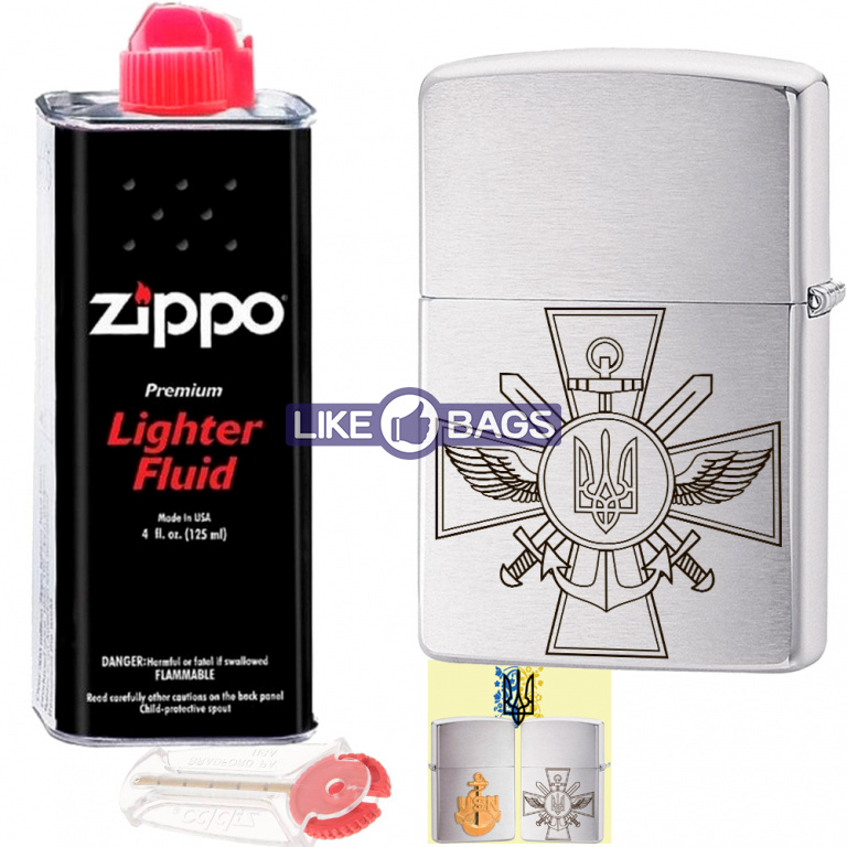 Запальничка Zippo "ЗСУ" Brushed Chrome використовує унікальну техніку горизонтального брашування, яка створює тонку горизонтальну текстуру на лицьовій та зворотній сторонах моделі. Сторони запальнички відполіровані до блиску додаткового розмаїття. Оздоблення Brushed Chrome було створено у 1933 році і досі залишається найпопулярнішою запальничкою Zippo.
