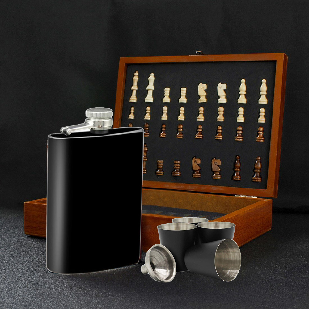 Інші складові, які входять до подарункового набору шахи з флягою, зроблені з дерева. Завдяки цьому набір виглядає особливо презентабельно, а скористатися ним – одне задоволення. Оформлений таким чином набір фляга та шахи зручно брати з собою в подорожі, на пікніки, в гості, ін. – усі складові комплекту залишаться на своїх місцях.