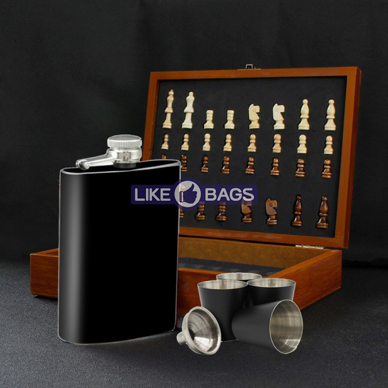 Металева фляжка для алкоголю вважається одним із найбільш безпрограшних та універсальних подарунків для чоловіків з будь-якого приводу. Більш ефектно подібний презент буде виглядати в стильній дерев'яній коробці, що одночасно є і шахівницею - саме в такому вигляді поставляється сувенірний набір шахи з флягою, купити який недорого ви можете в інтернет-магазині Likebags.