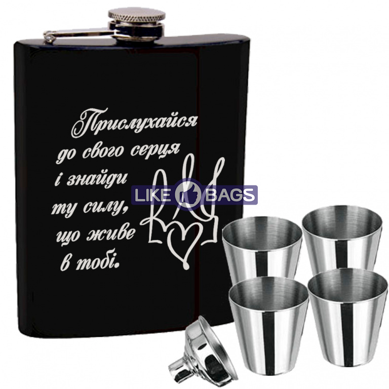 Насамперед, він привертає увагу своїм ефектним зовнішнім виглядом. Металева поверхня чорного кольору з матовим покриттям, ідеально гладка конструкція, зручна прямокутна форма - фляга для гравіювання зі стосами виконана дуже якісно, тому користуватися нею одне задоволення. Поставляється вона в комплекті з невеликою лійкою, за допомогою якої зручно наповнювати ємність спиртними напоями. Всі деталі виготовлені з міцної харчової сталі, тому їм не страшні подряпини та інші пошкодження.