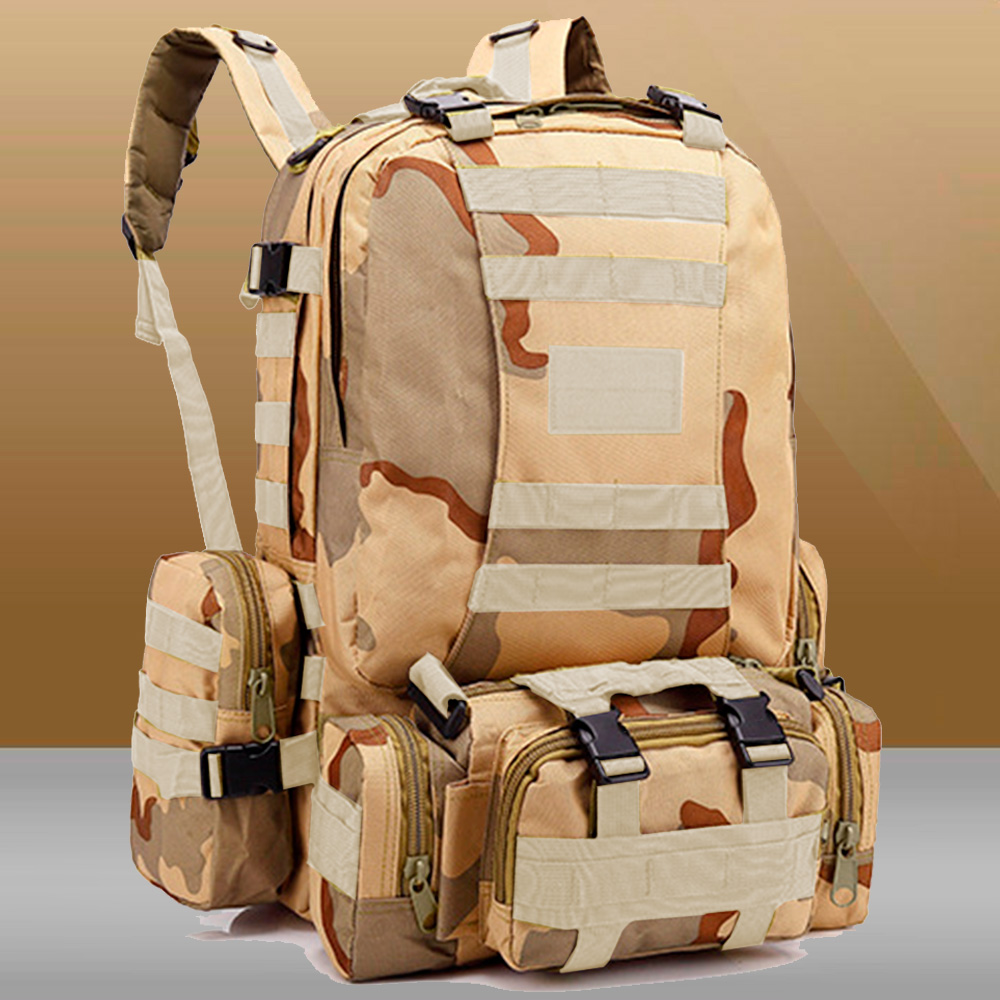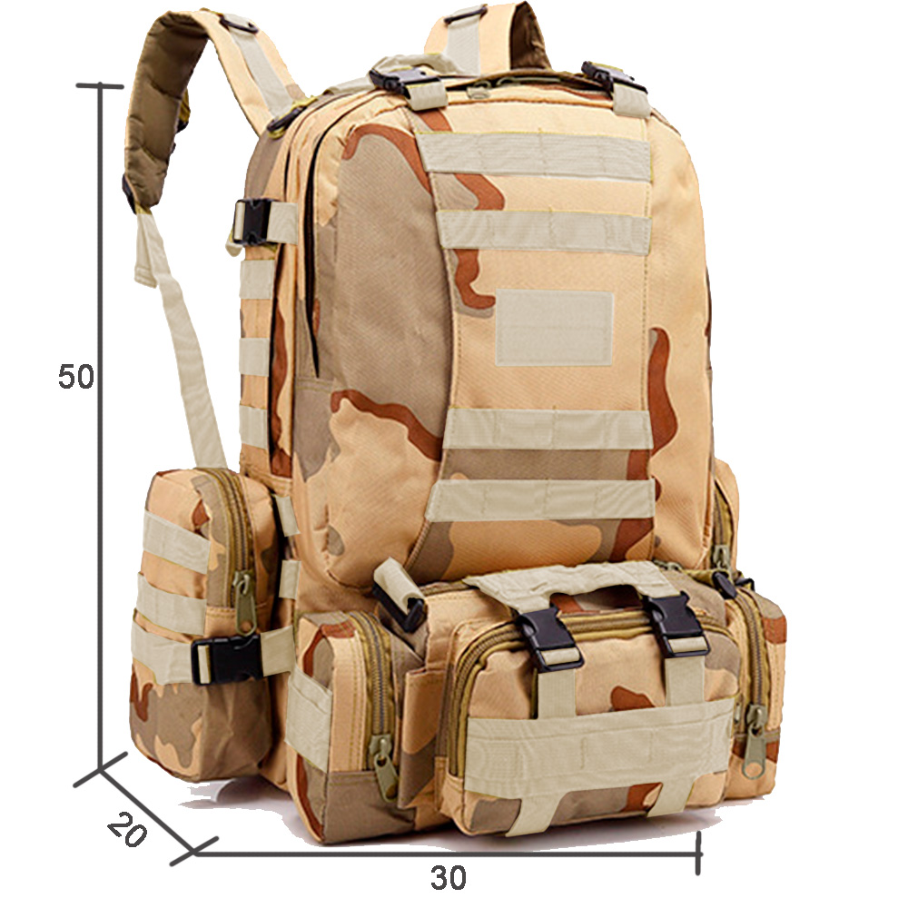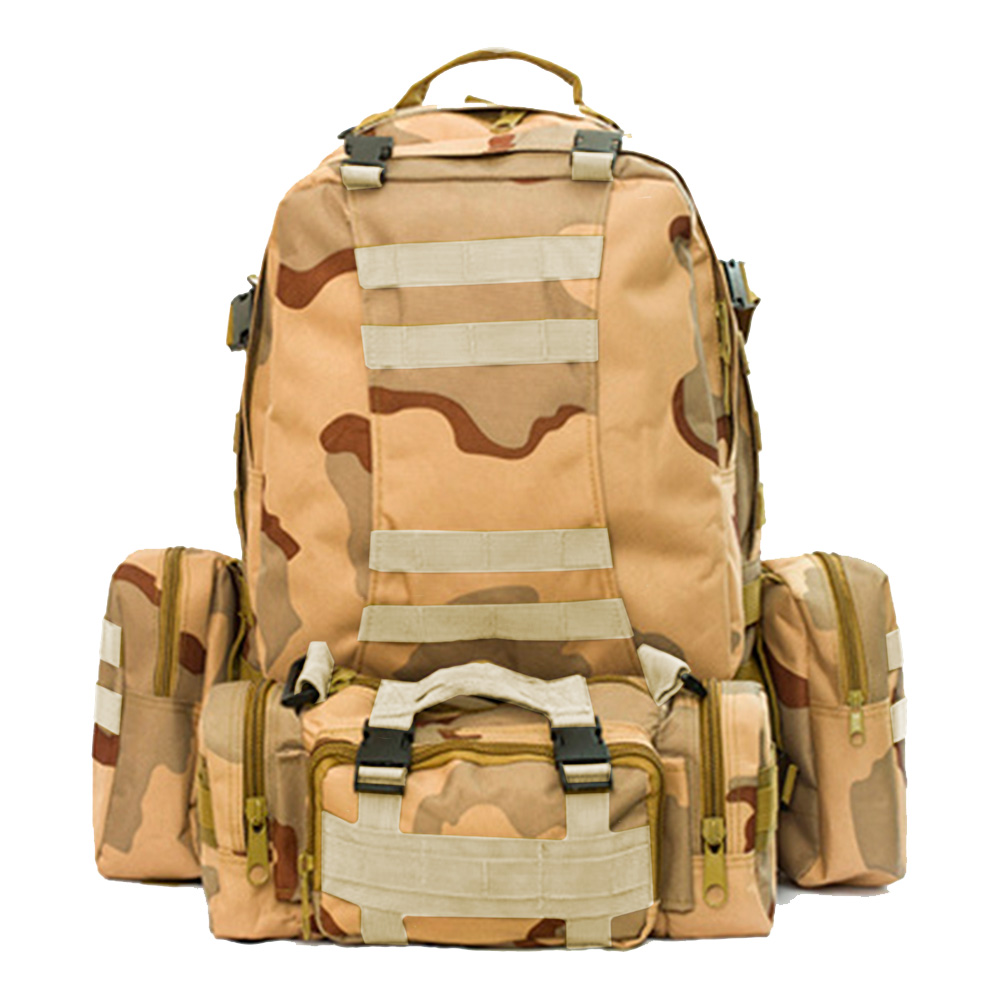 Тактичний рюкзак виготовлений із водонепроникного та міцного поліестеру високої щільності 600D (900X600). Місткий військовий рюкзак має одне велике основне відділення, одну передню знімну сумку, яку можна використовувати окремо як тактичний поясний рюкзак, дві бічні знімні сумки для аксесуарів для тактичного рюкзака як туристичні спортивні сумки. Цей багатоцільовий рюкзак може працювати як рюкзак на 50 і 60 л.