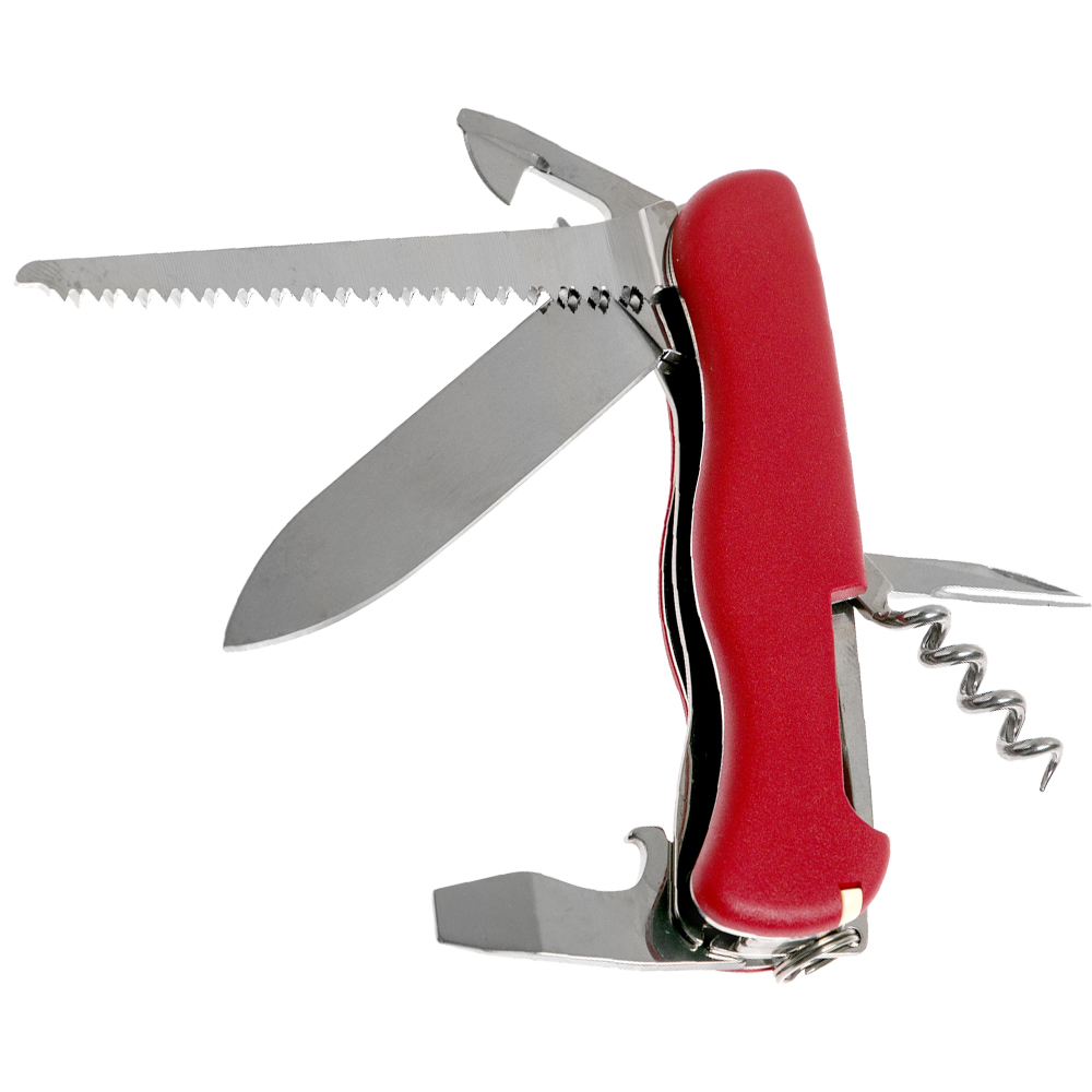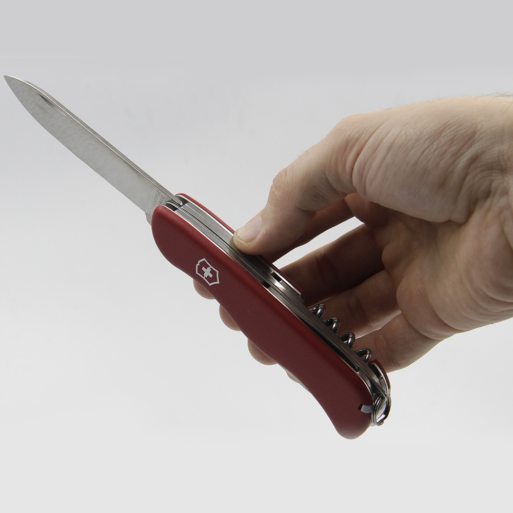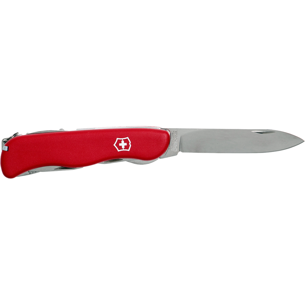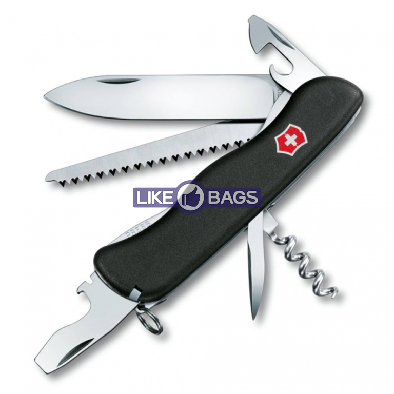 Солдатський ніж Victorinox FORESTER (Лісник) 111 мм, з великим фіксованим лезом, що вивільняється пружиною, виконує 12 функцій. Повнорозмірне лезо досить широке та міцне, консервний ніж, відкривачка для пляшок та штопор зручні та надійні, а гостра пила просто незамінна при розпалюванні багаття.