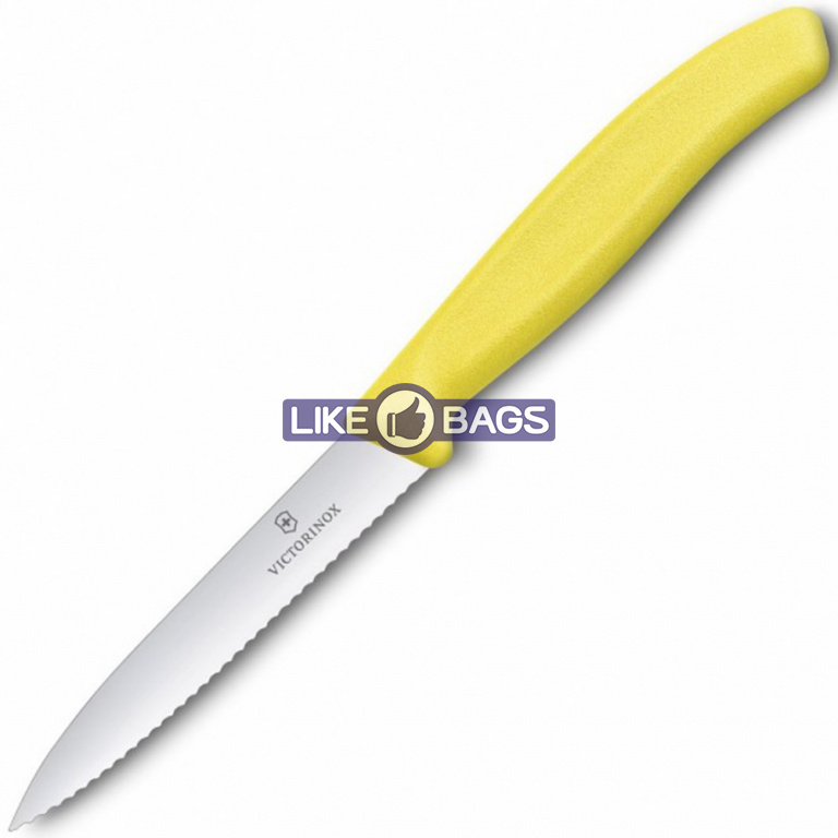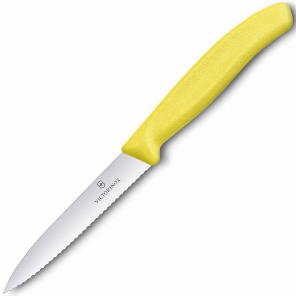 Ніж для очищення овочів жовтий Swiss Classic - це ультра гострий овочевий ніж із хвилястим вістрям, загостреним кінцем, виготовлений Victorinox.