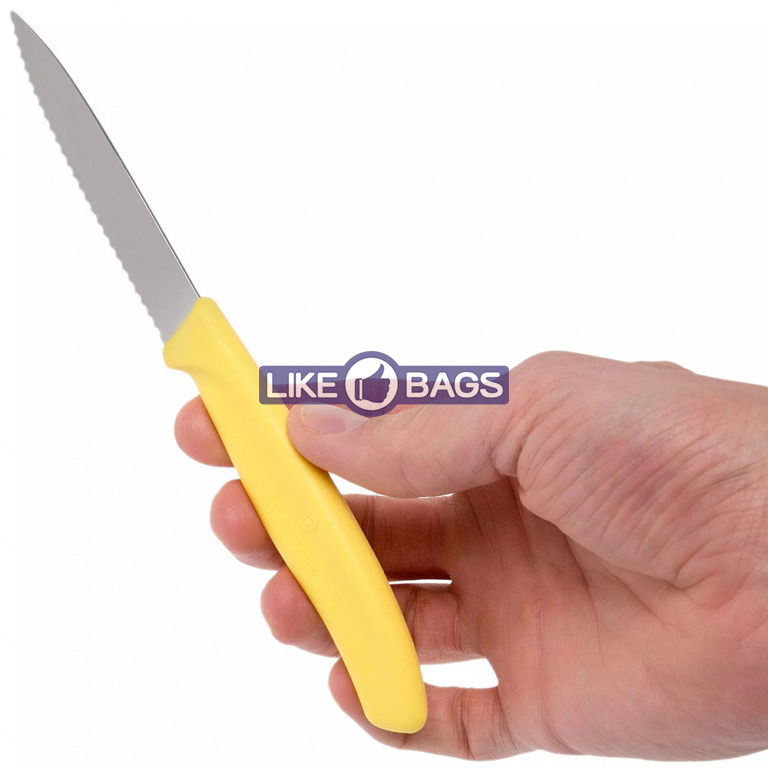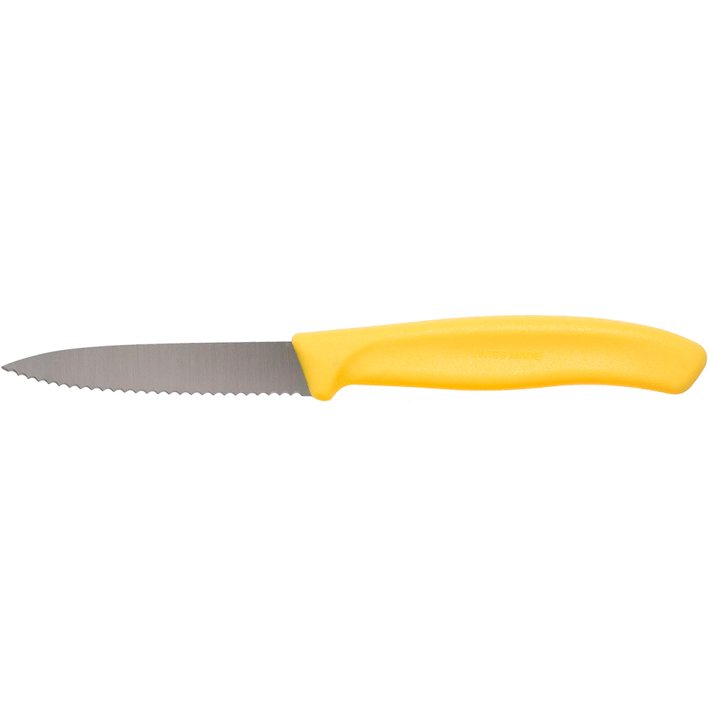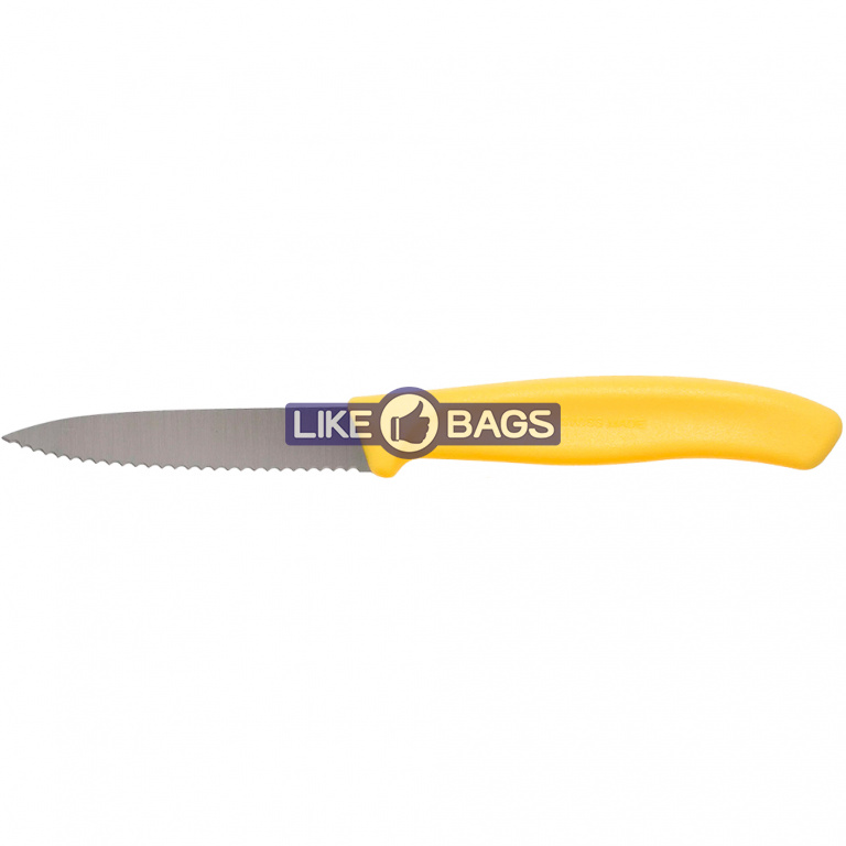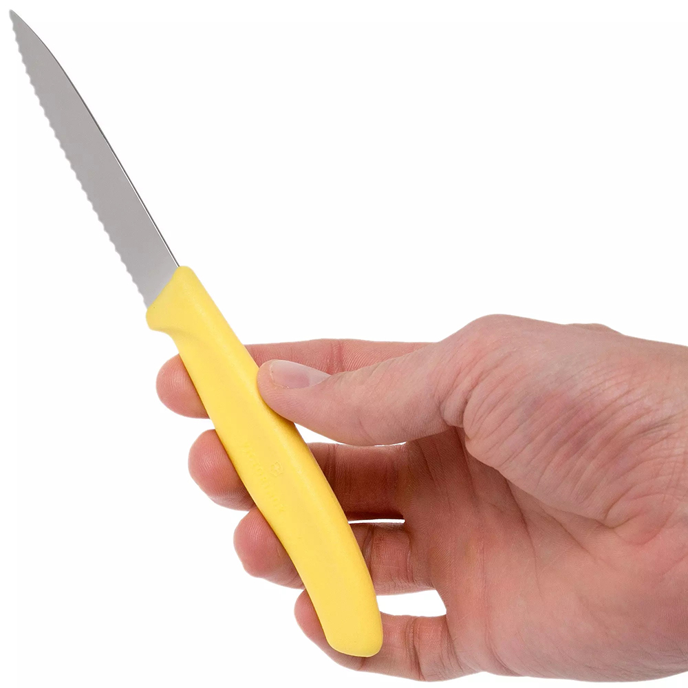 Ніж для овочів Victorinox SwissClassic із зазубринами жовтого кольору — це універсальне доповнення до будь-якої кухні та столу. Завдяки маленькому, тонкому лезу та зубчастому краю ви можете легко очистити та нарізати овочі, фрукти чи невеликий буханець хліба.