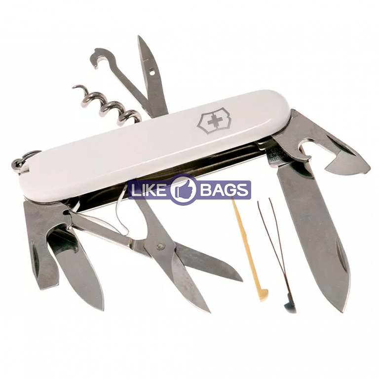 Функції інструменту: велике лезо + / зубочистка + / інструмент для зняття ізоляції + / консервний ніж + / мале лезо + / багатофункціональний гак + / ножиці + / відкривалка для пляшок + / пінцет + / плоска викрутка (велика ) + / плоска викрутка (маленька) + / страхувальне кільце + / шило, кернер + / штопор +