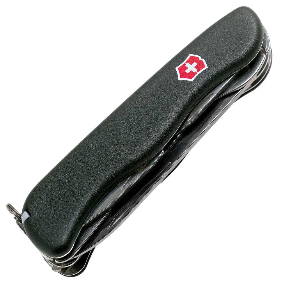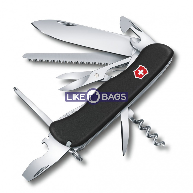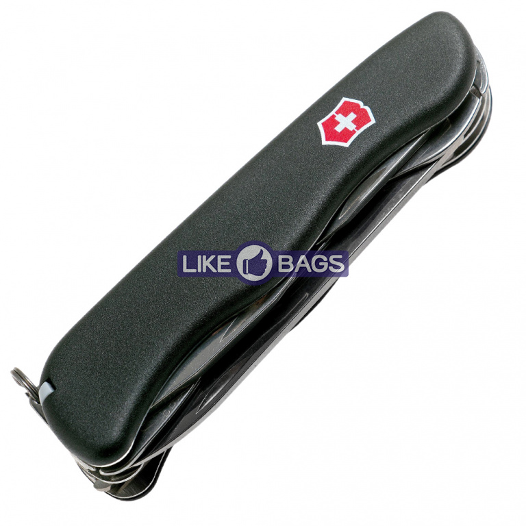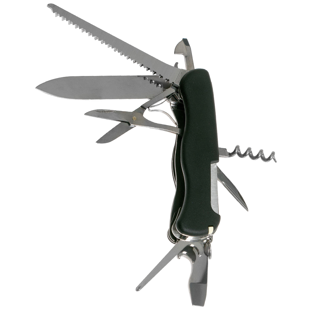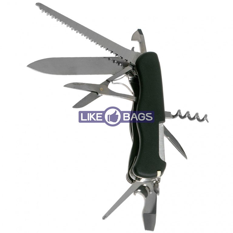 Функції інструменту: велике лезо + / довга хрестова викрутка + / зубочистка + / інструмент для зняття ізоляції + / консервний ніж + / ножиці + / відкривалка для пляшок + / пила по дереву + / пінцет + / плоска викрутка (велика) + / плоска викрутка (маленька) + / страхувальне кільце + / шило, кернер + / штопор +