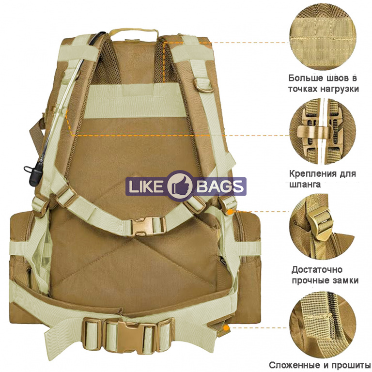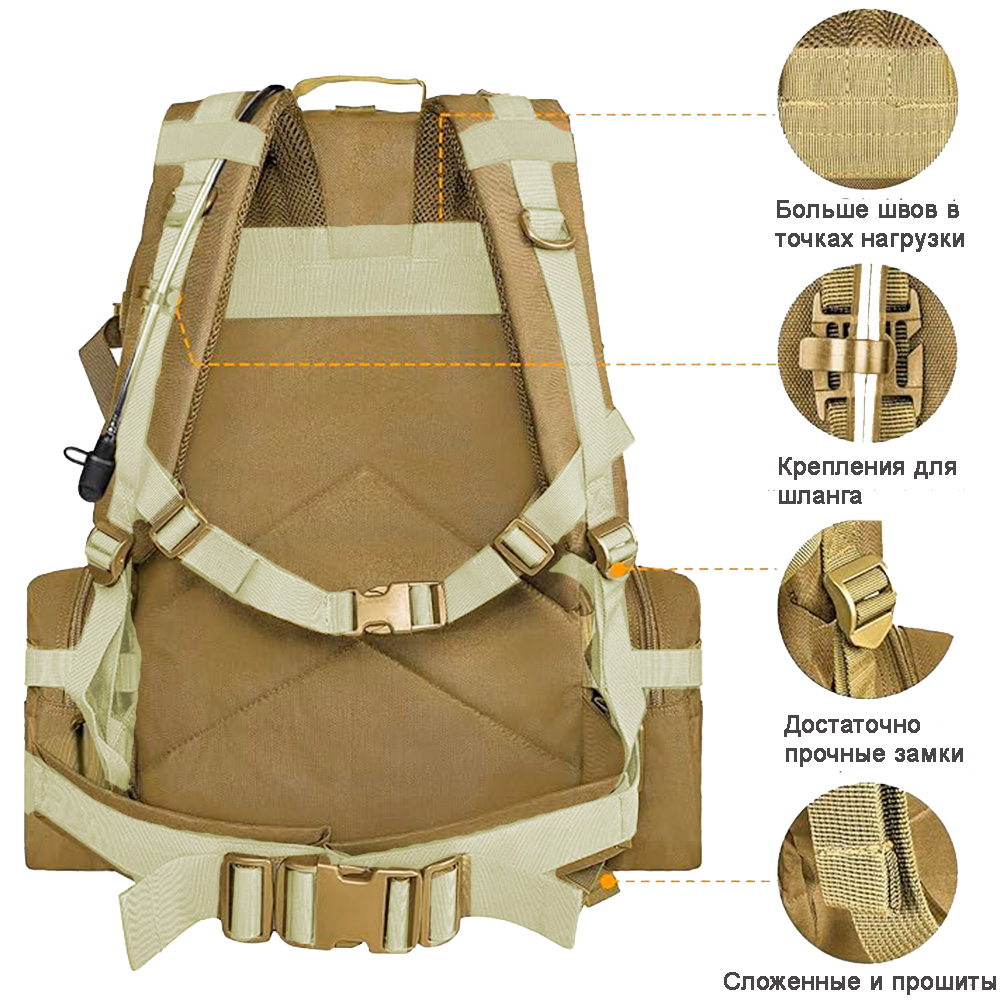 Тактичний рюкзак виготовлений із водонепроникного та міцного поліестеру високої щільності 600D (900X600). Місткий військовий рюкзак має одне велике основне відділення, одну передню знімну сумку, яку можна використовувати окремо як тактичний поясний рюкзак, дві бічні знімні сумки для аксесуарів для тактичного рюкзака як туристичні спортивні сумки. Цей багатоцільовий рюкзак може працювати як рюкзак на 50 і 60 л.