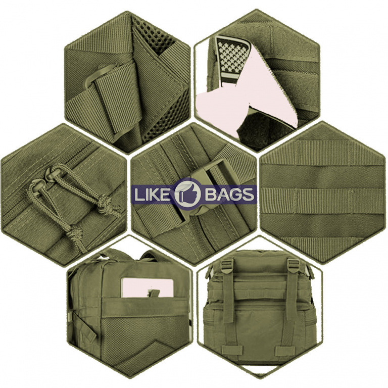 Система лямок рюкзака Molle спереду та з боків, призначена для використання в поєднанні з іншим спорядженням, ви можете прикріпити додаткові сумки або спорядження як тактичний рюкзак.
