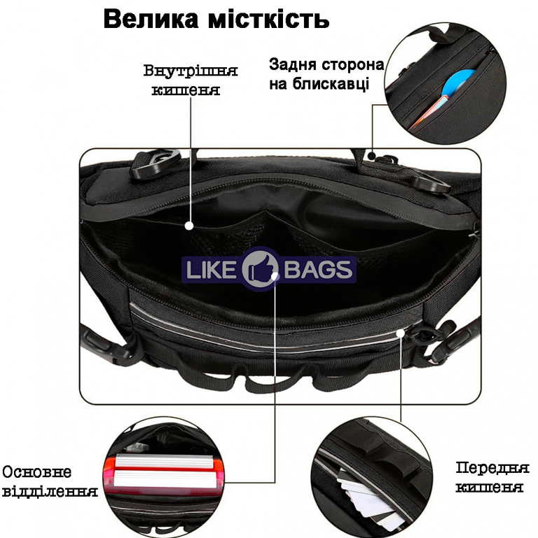 Внутрішній простір військової сумки Discovery B520 організований з максимальною ефективністю, щоб кожен предмет мав своє місце. Основне відділення, захищене надійною блискавкою з двома бігунками, забезпечує зручний та швидкий доступ до вмісту. Всередині цього відділення розташовані дві невеликі відкриті кишені, ідеальні для зберігання дрібниць, таких як ключі, USB-накопичувачі або навушники, допомагаючи підтримувати бездоганний порядок. На фронтальній стороні сумки передбачено додаткове відділення на блискавці, куди можна безпечно помістити телефон або важливі документи. Окремо варто відзначити приховане відділення на блискавці на тильній стороні сумки – воно забезпечує підвищений рівень безпеки для цінностей, таких як паспорт або готівка, оскільки щільно прилягає до тіла, додаючи додатковий захист від сторонніх очей. Важливо, що всі блискавки оснащені захистом від вологи, що гарантує збереження вмісту навіть у несприятливу погоду.